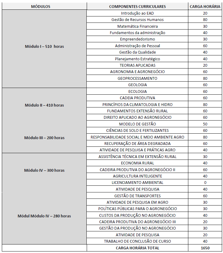 MATRIZ CURRICULAR: A grade curricular do Curso Técnico em Agronegócios foi desenvolvida para atender todos os requisitos legais previstos pela legislação federal e estadual. O curso abrange disciplinas que capacitam você a atuar com excelência no vasto setor agrícola brasileiro.
