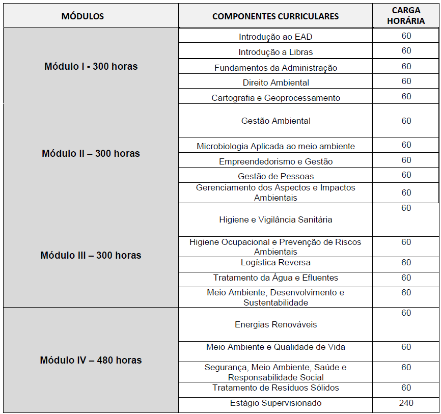 A grade curricular do Curso Técnico em Meio Ambiente foi desenvolvida com muito carinho, seguindo todos os requisitos legais da legislação federal e estadual. Você terá a oportunidade de explorar disciplinas essenciais que capacitam você a atuar em um dos setores mais importantes da atualidade.
