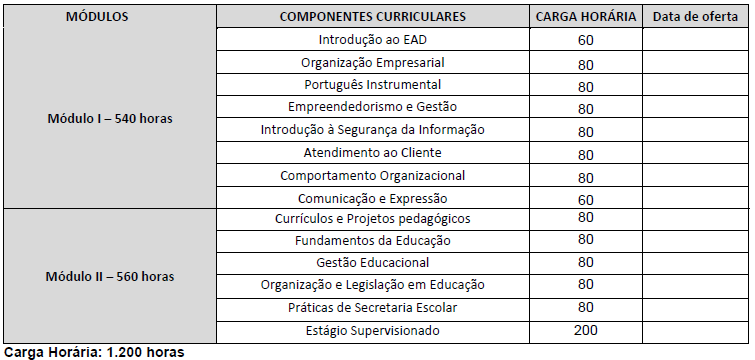 A grade curricular do curso Técnico em Secretaria Escolar foi elaborada para atender todos os requisitos legais conforme a legislação federal e estadual. O curso abrange disciplinas essenciais que capacitam você a atuar com competência no ambiente escolar.